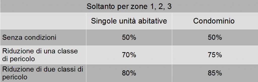 Se l’intervento edilizio in zona 1, 2 e 3 coinvolge le parti comuni degli edifici e comporta una riduzione del rischio sismico a una classe di rischio inferiore, la detrazione è pari al 75%.